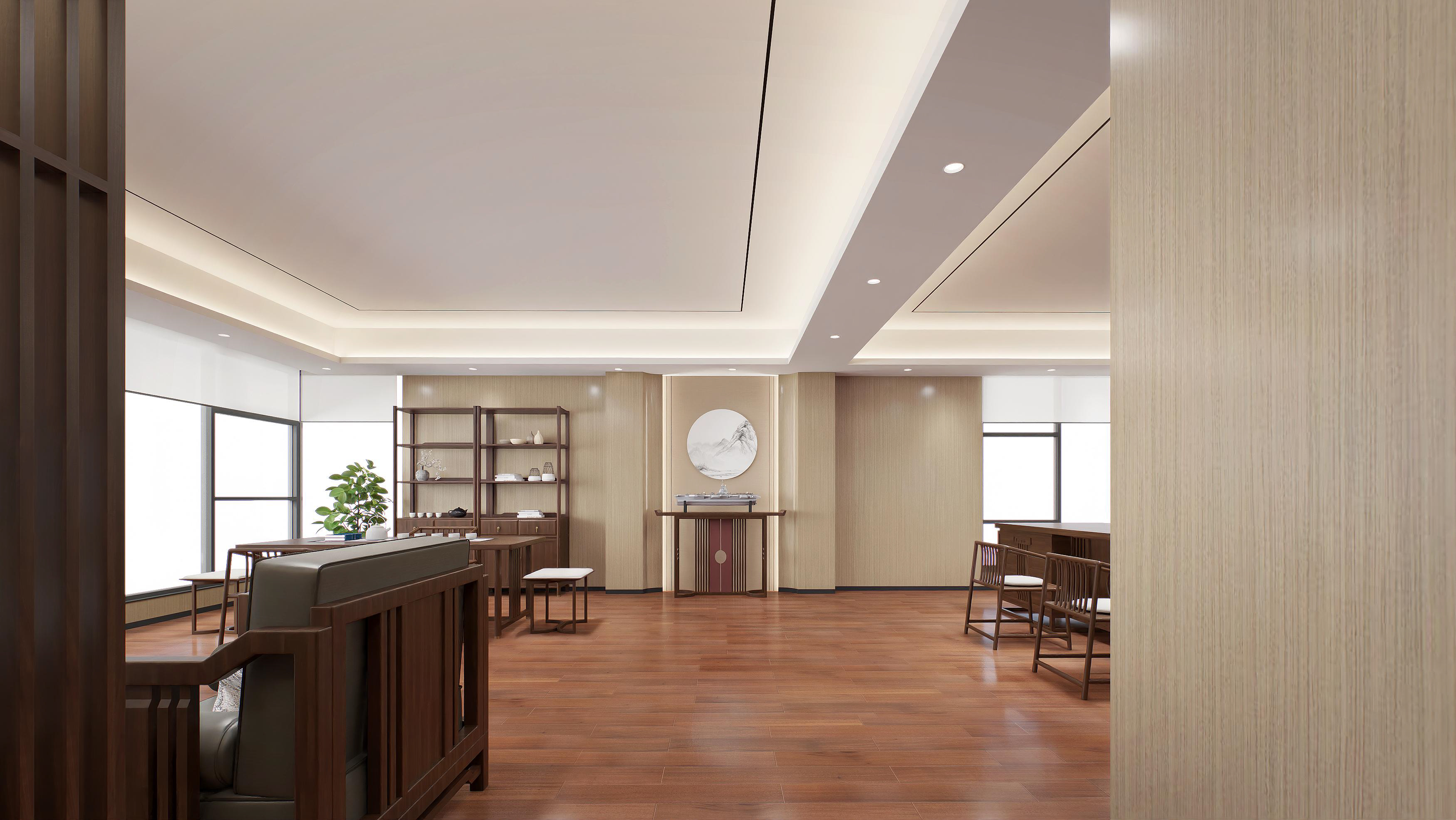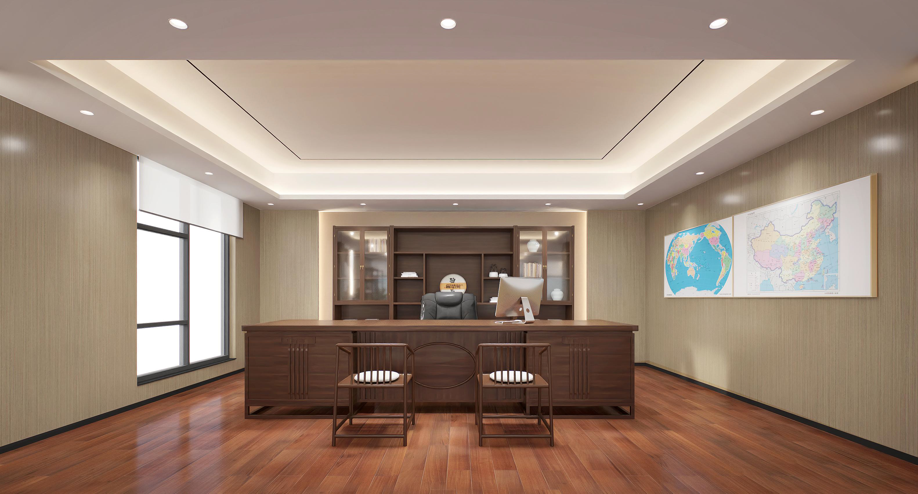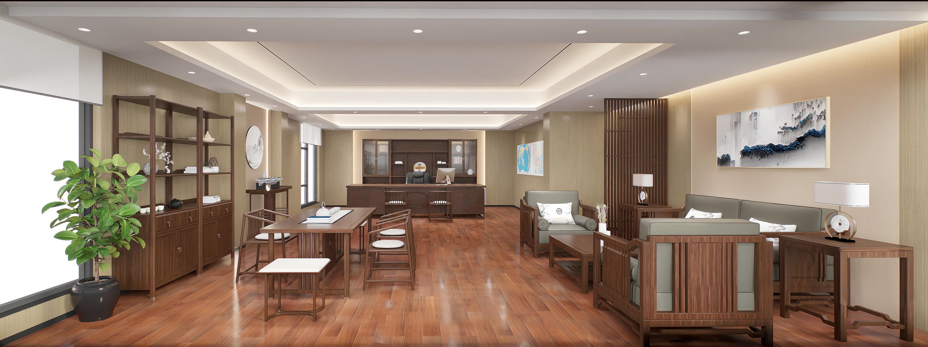 半包圍式的書吧設計,為員工提供具有一定私密性的休閑空間,有利于員工的身心放松,同時也體現了企業的人文關懷。會議室以斑點玻璃作為隔斷,保證了空間的通透、明亮。整體以木色調為主,增加親和力。董事長辦公室以中式為主,凸顯沉穩大氣感。