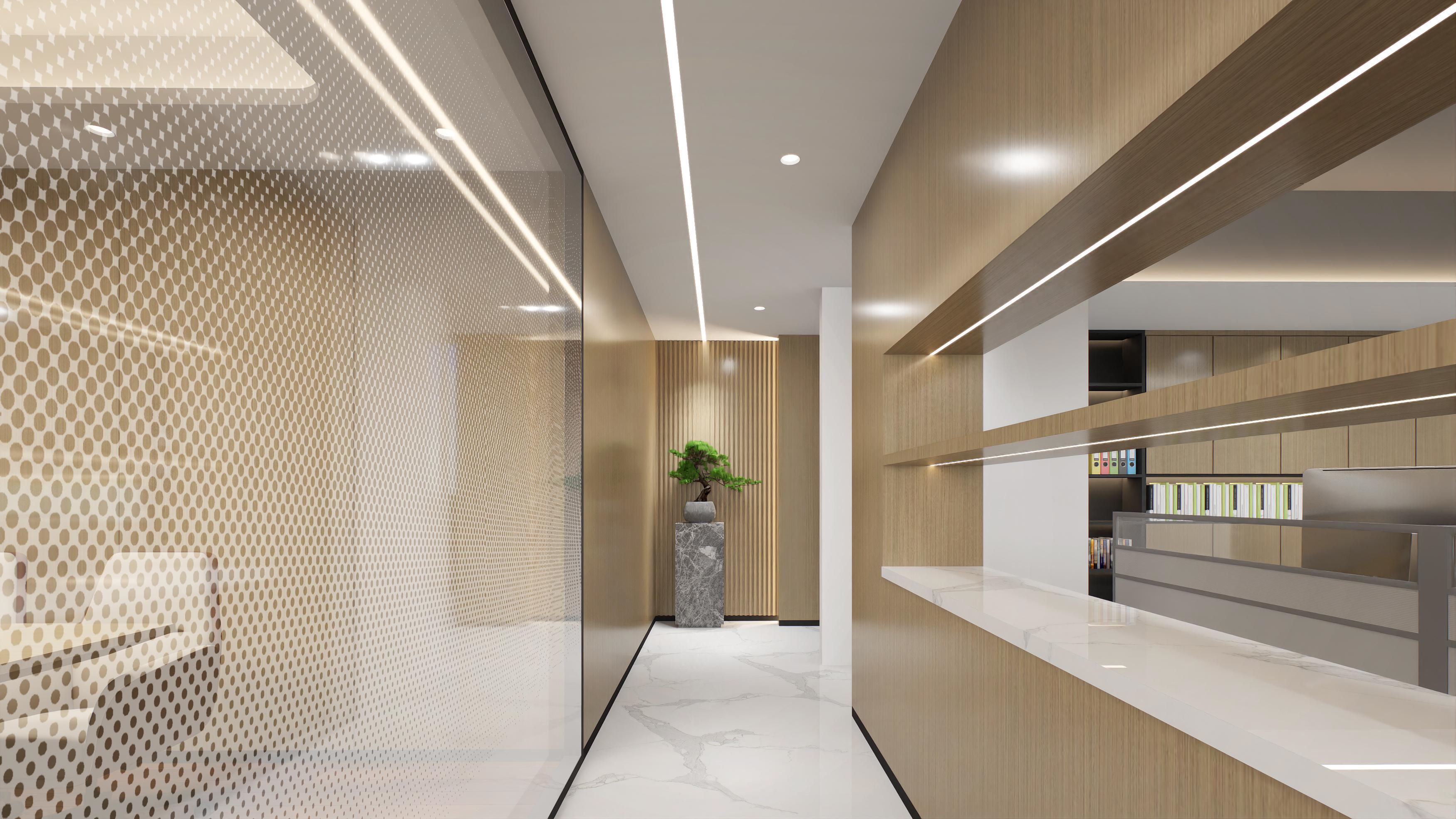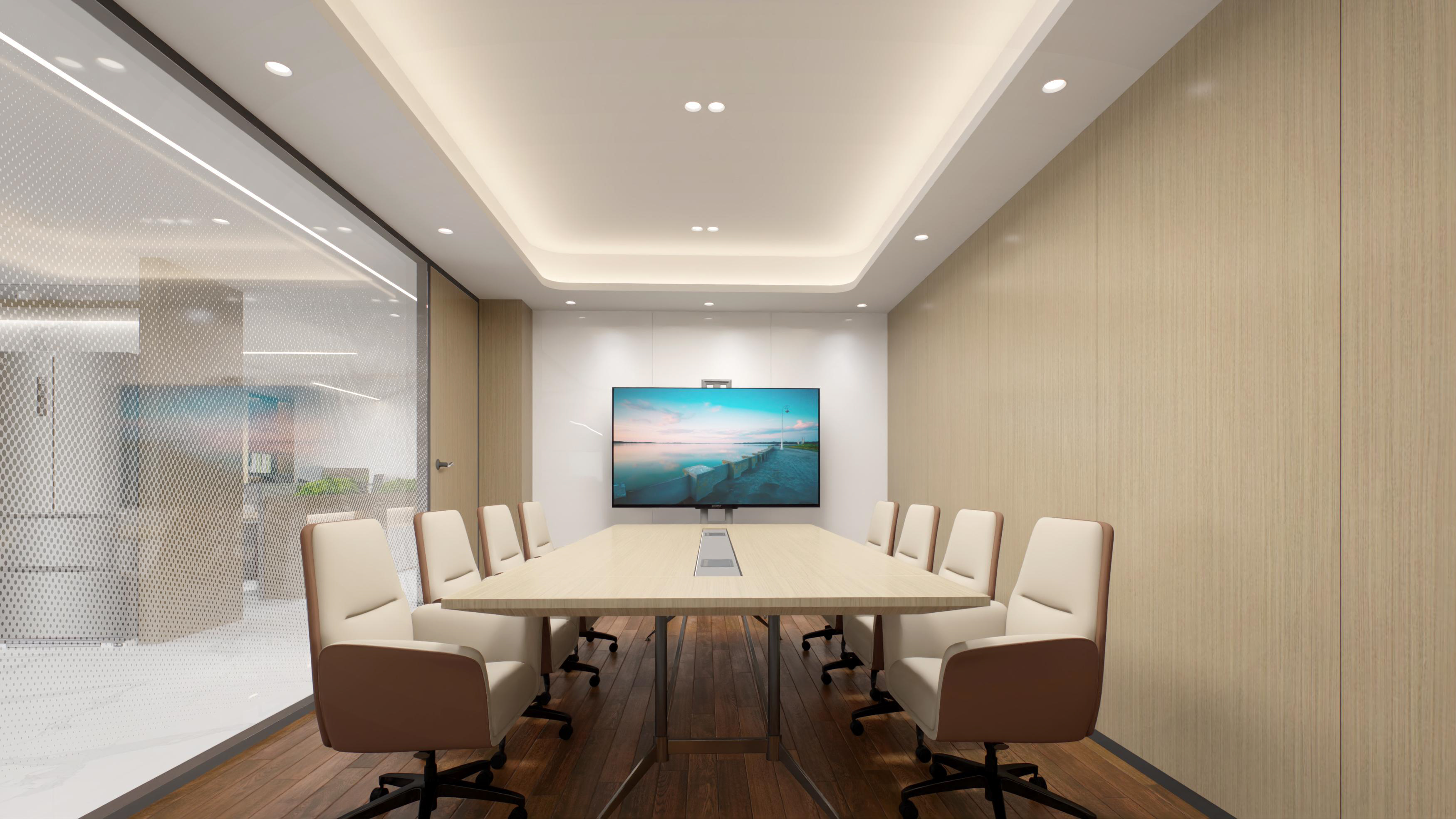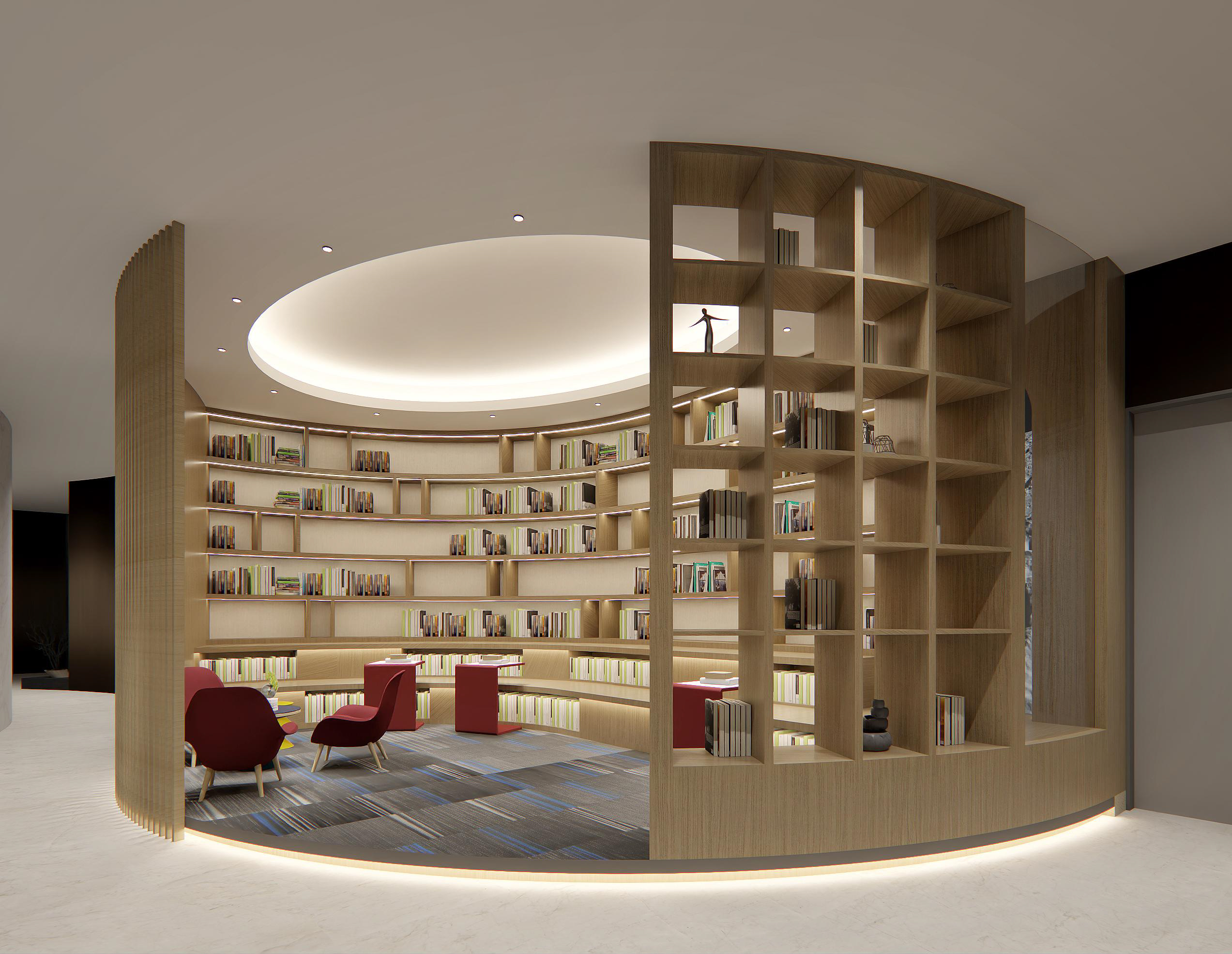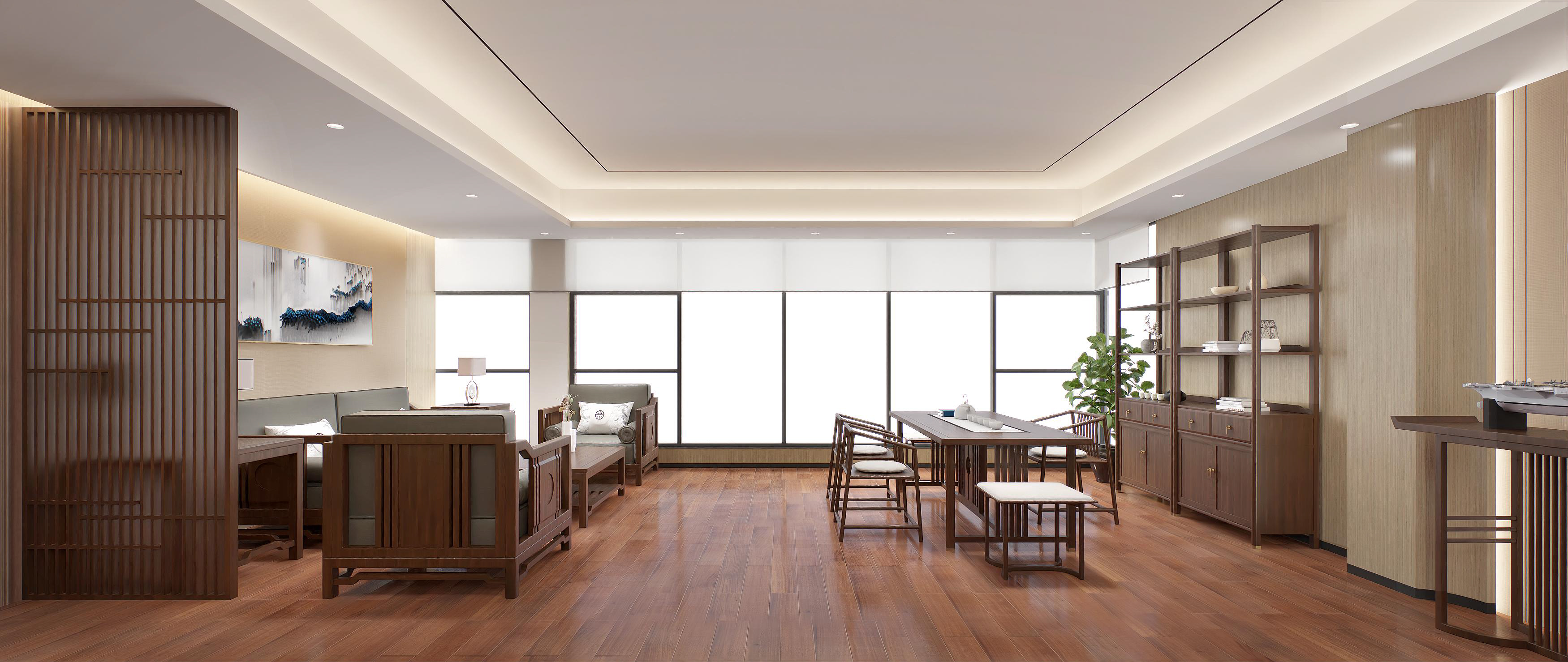 半包圍式的書吧設計,為員工提供具有一定私密性的休閑空間,有利于員工的身心放松,同時也體現了企業的人文關懷。會議室以斑點玻璃作為隔斷,保證了空間的通透、明亮。整體以木色調為主,增加親和力。董事長辦公室以中式為主,凸顯沉穩大氣感。