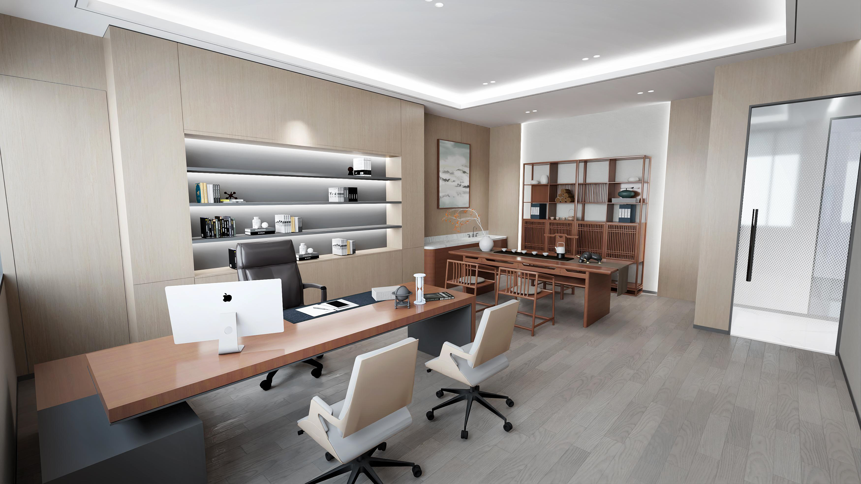 logo墻簡潔明了,節省空間,綠植和墻壁相互映襯,沉穩大氣。整體以灰色調為主,打造簡約風格的同時突出科技感。總經理辦公室中式家具以及其他裝飾物的搭配使用,突顯公司品味。