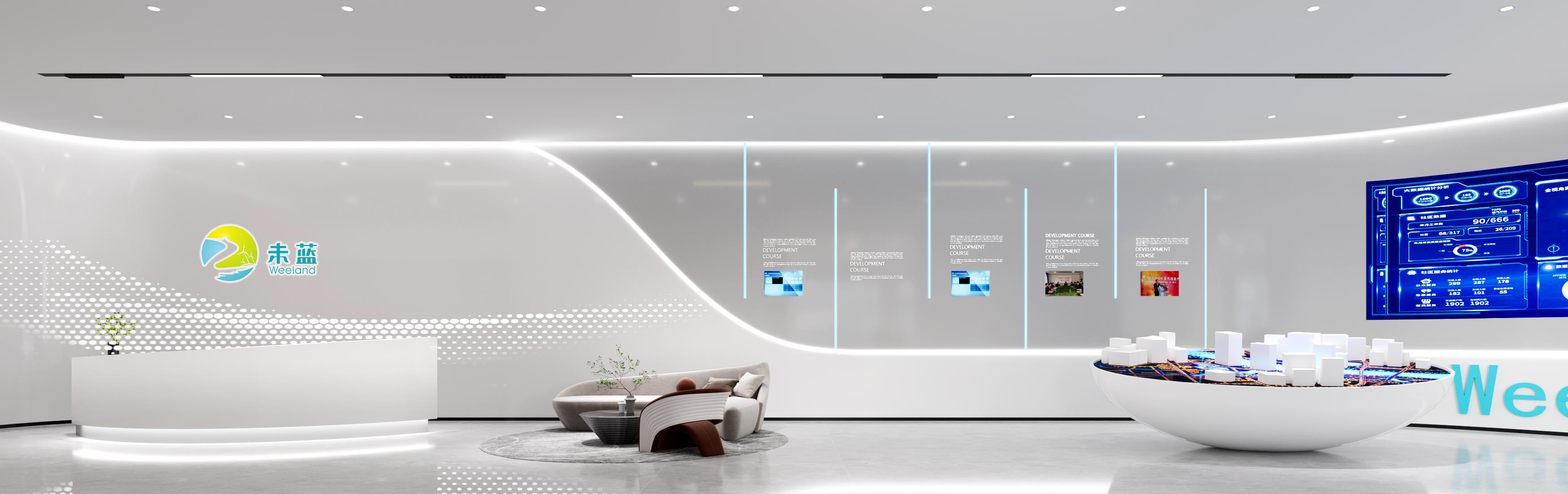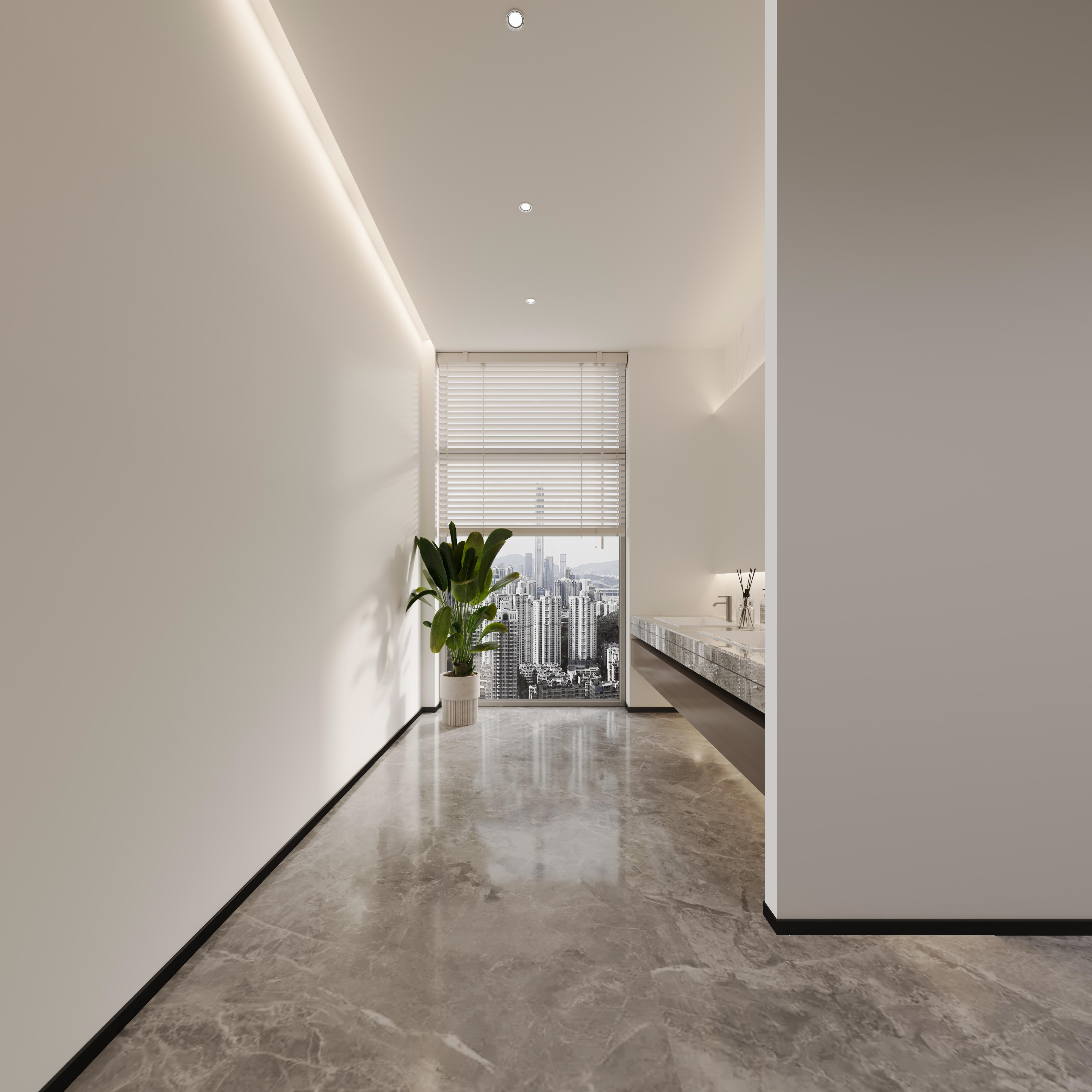 冷色為主色調,營造簡約、現代感,光點增加動態感,增添活力。隱藏式照明,減少視覺上的雜亂,空間看起來更加簡潔。開放式辦公室,使空間開闊,玻璃隔斷,增加了辦公空間的通透、明亮。