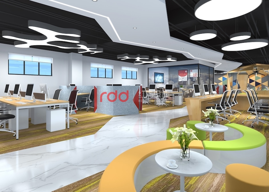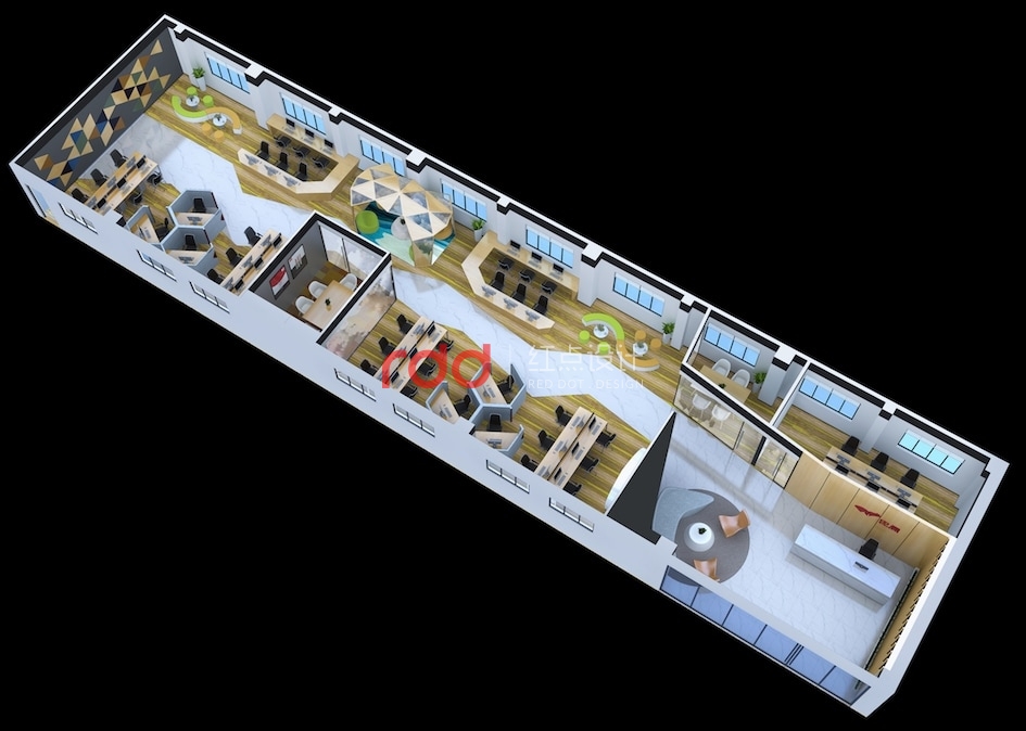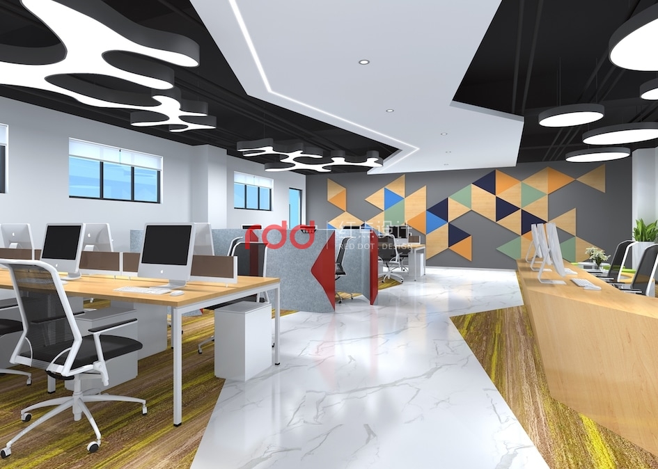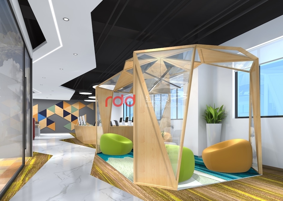 魔方是智慧與創(chuàng)意的產(chǎn)物,同時(shí)也是色塊碰撞的結(jié)合體。青創(chuàng)工作室針對(duì)的是年輕的新生力量,結(jié)合對(duì)象的特性,紅點(diǎn)裝飾的設(shè)計(jì)師大膽地運(yùn)用撞色與拼色的原理,把藍(lán)色與黃色這一強(qiáng)烈的對(duì)比色作為空間的點(diǎn)綴色,在大面積地運(yùn)用黃色、木色這兩種鄰近色,這不得不讓人覺得設(shè)計(jì)師是在玩填色游戲。