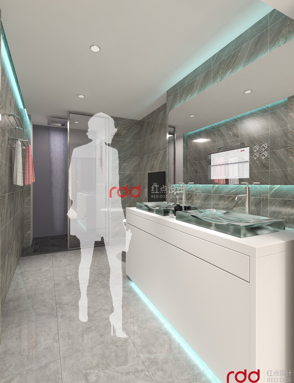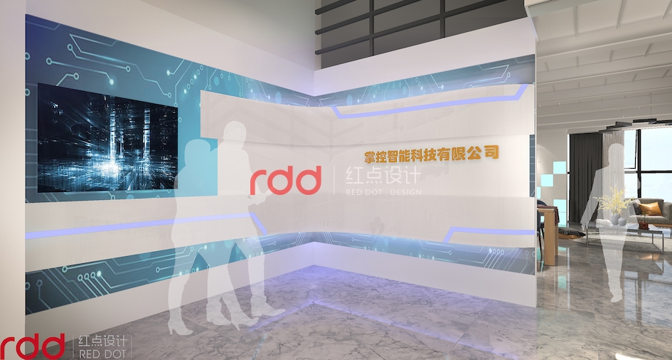 藍色強調科技、效率,表現出一種美麗、冷靜、理智、安詳與廣闊。因此在休閑和接待室,用藍色的線條、色塊來作點綴,結合燈光的效果,突出空間的科技感。