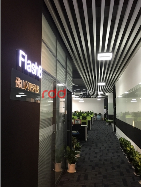 背景墻以黑色為底,發(fā)光LOGO字,白色鋁格柵從前臺(tái)區(qū)域一直延伸到開放辦公區(qū),整體空間以黑白為主色調(diào),時(shí)尚個(gè)性。