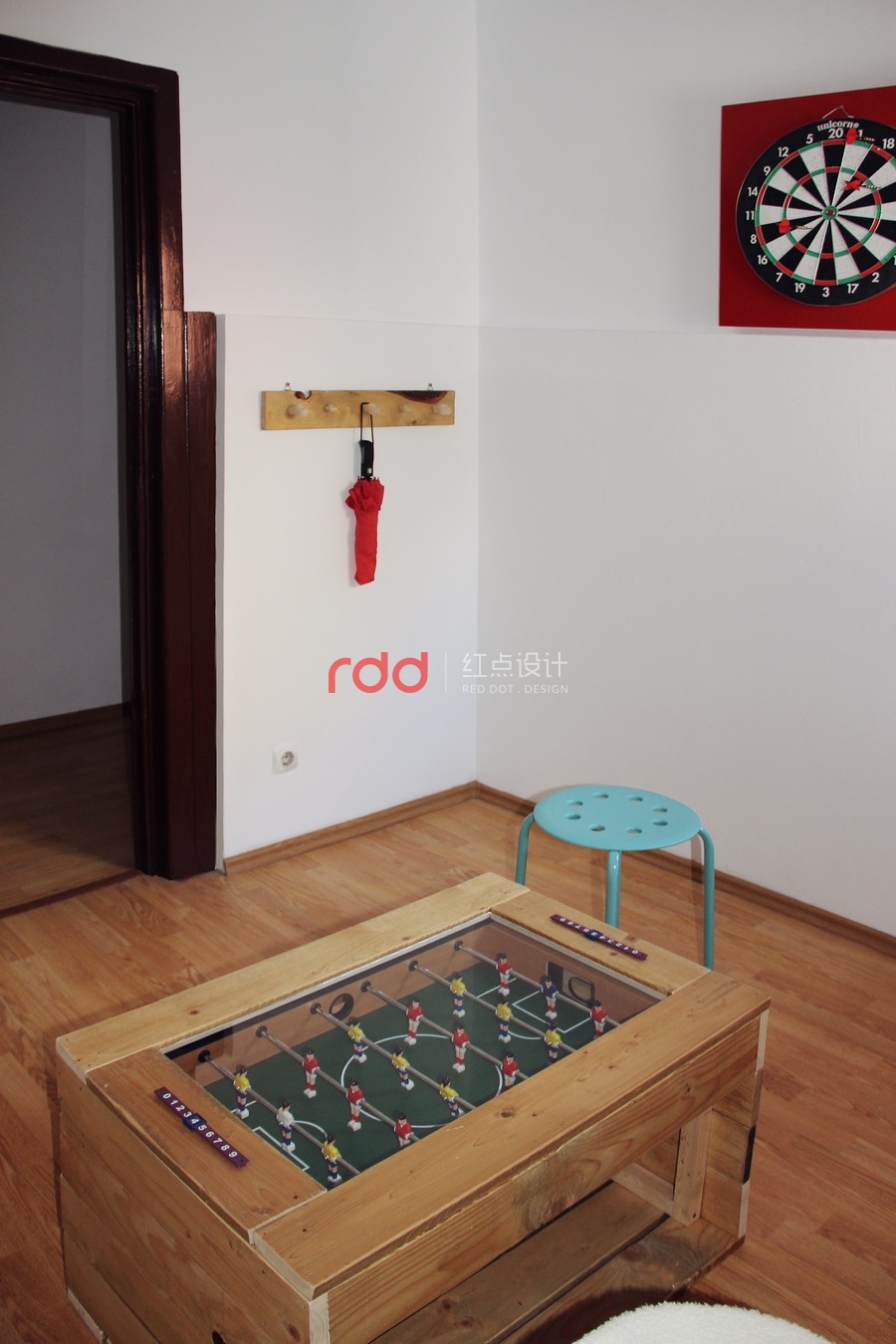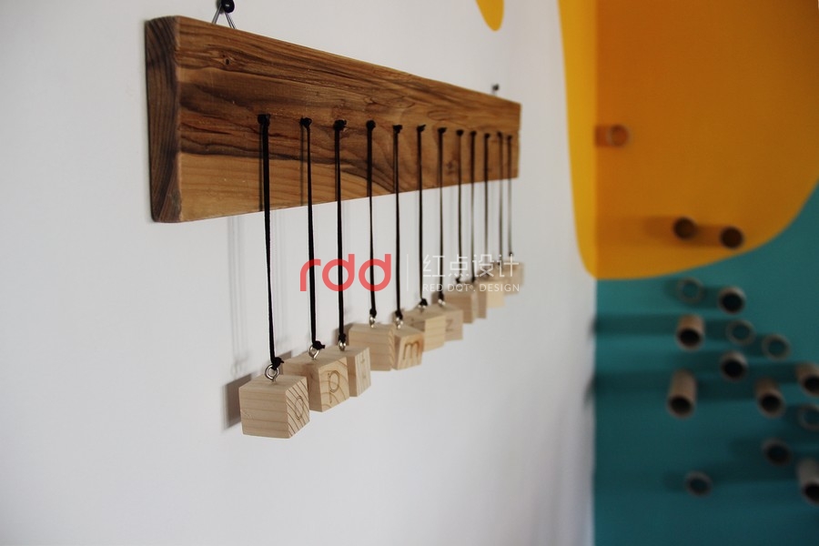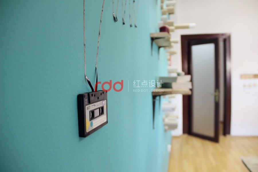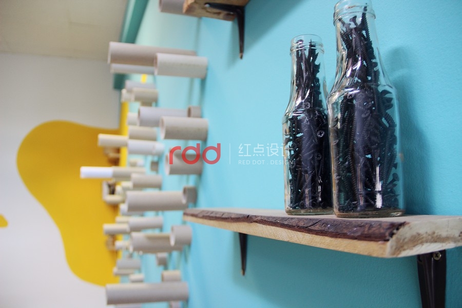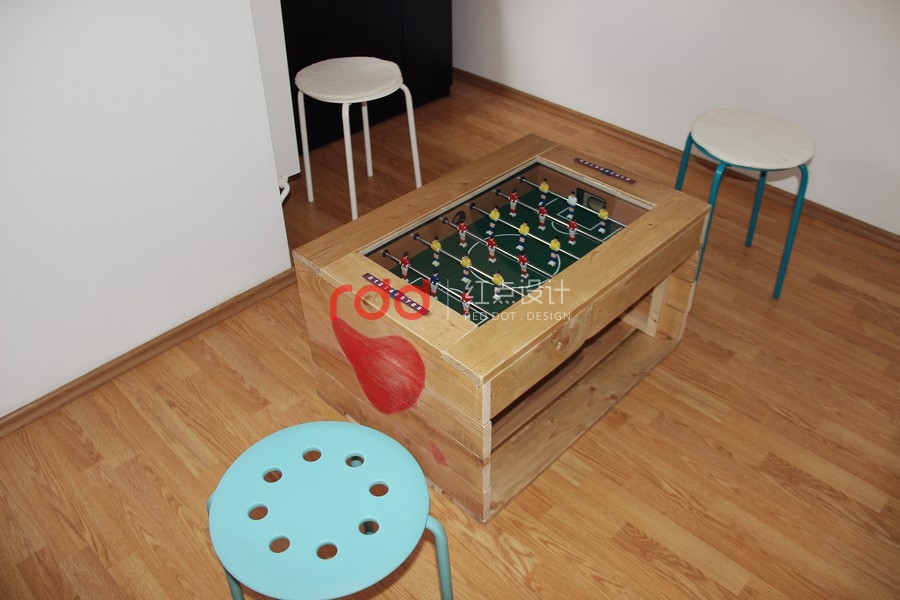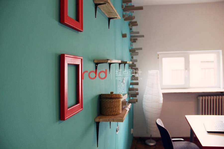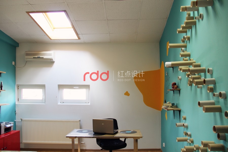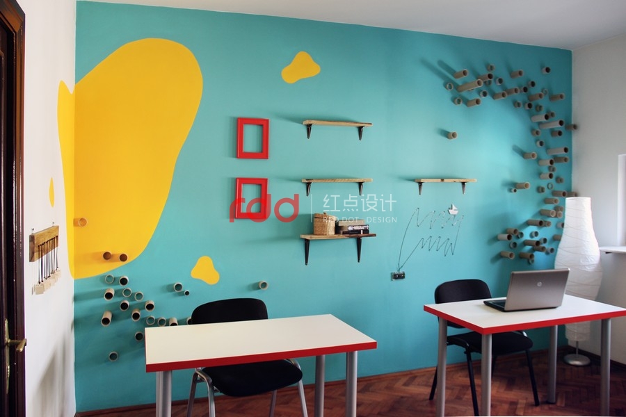 其中的一個(gè)房間,設(shè)計(jì)師在厚木板制作的書桌上運(yùn)用玻璃覆蓋,設(shè)計(jì)了兩個(gè)非常有趣的書桌。為了創(chuàng)造更多個(gè)性化設(shè)計(jì),設(shè)計(jì)師運(yùn)用家具、小擺飾,懷舊飾品打造獨(dú)特的空間。墻面上的架子是用和書桌相同材質(zhì)的木板所制作的。另外一個(gè)房間延續(xù)了相同的風(fēng)格,使用了一樣的顏色以及墻壁裝飾。房間墻面上的圓筒造型的紙板管,是非常具有創(chuàng)意的設(shè)計(jì),當(dāng)窗外的陽光透入室內(nèi),搭配鮮艷色調(diào)的墻面,創(chuàng)造一個(gè)活力十足的個(gè)性化空間。在休息室內(nèi),擺放了桌上足球桌并且規(guī)畫了和其他空間一樣的有趣桌子。不同的材質(zhì)、工具創(chuàng)造不同的有趣設(shè)計(jì)。